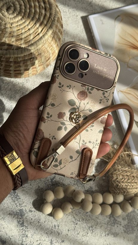 قاب موبایل آیفون گل رز فلورا قهوه ای + بندست چرمی