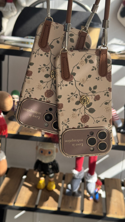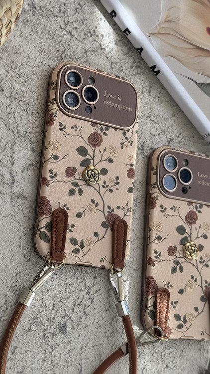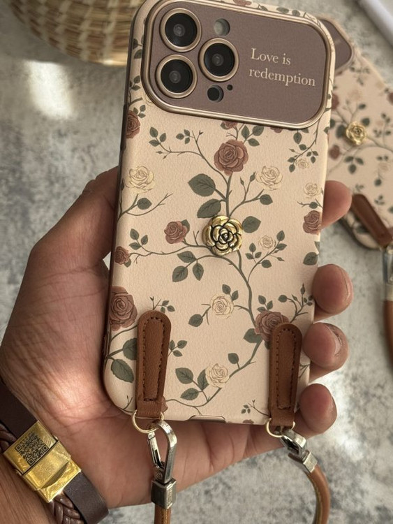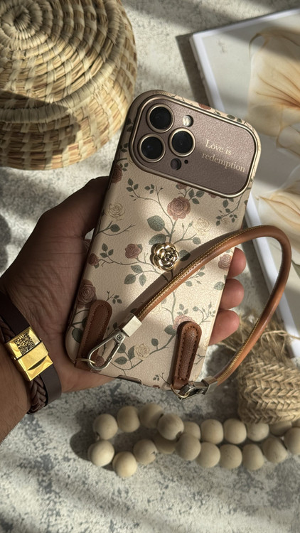 قاب موبایل آیفون گل رز فلورا قهوه ای + بندست چرمی