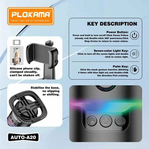 نام کالاPlokama Auto-A20 AI Gimbal Stabilizerوزن کالا220 گرمابعاد کالا180 × 82 × 82 میلی مترنوع کالالرزشگیر و تعقیب سوژهشرکت سازندهپلوکاما