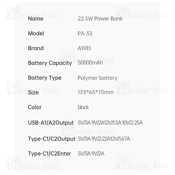 Type-C1/2 Output: 5V/3A 9V/2.22A 12V/1.67A(20W) - USB1/2 Output: 5V/3A 9V/2A 10V/2.25A 12V/1.5A(22.5W)