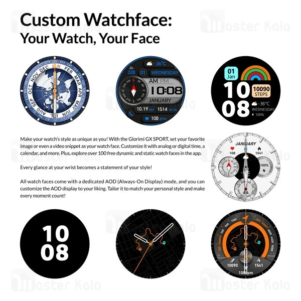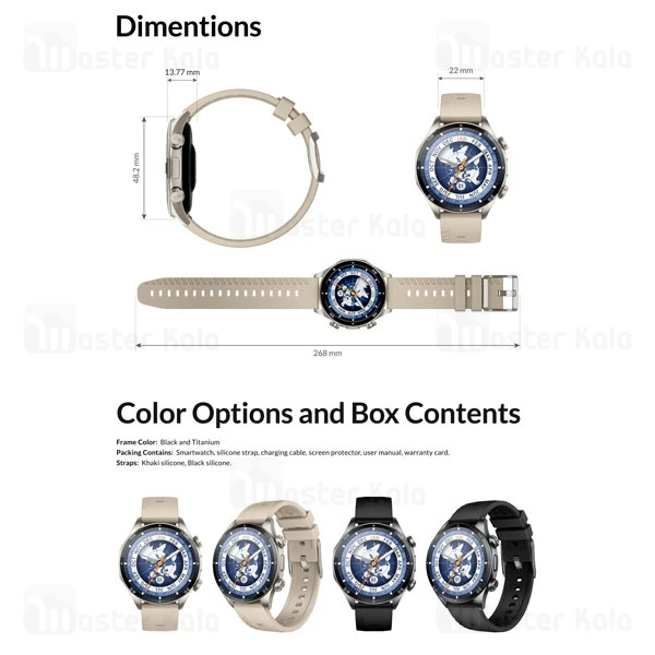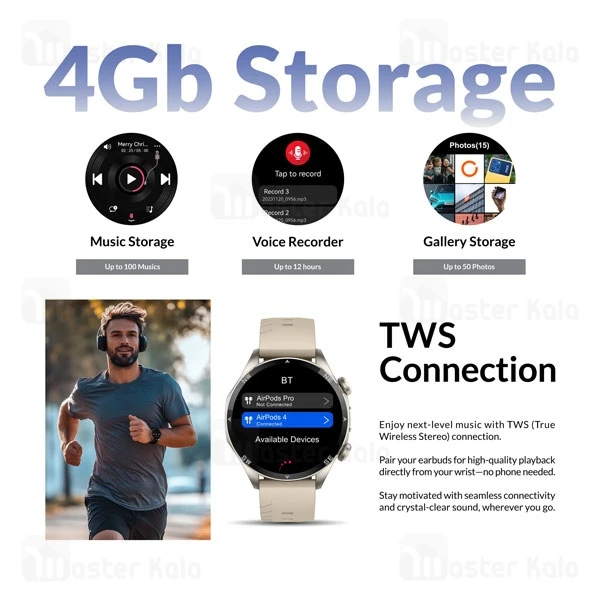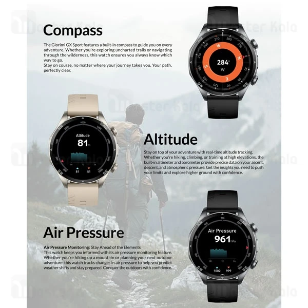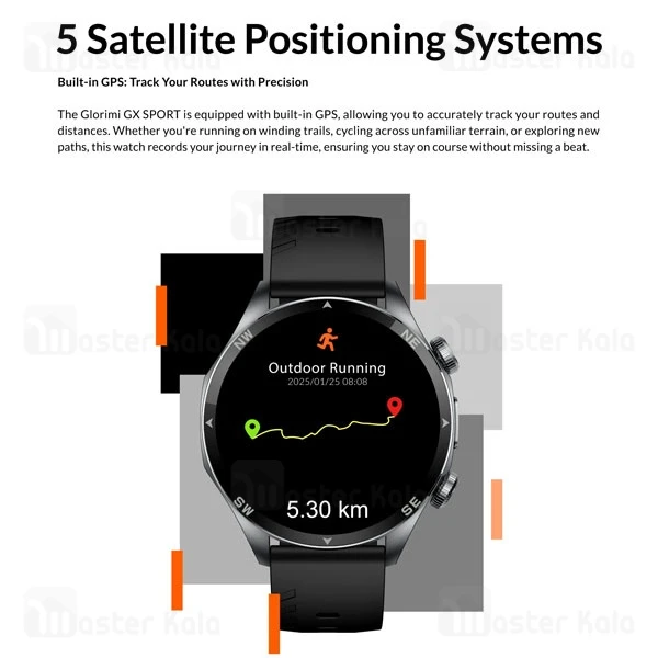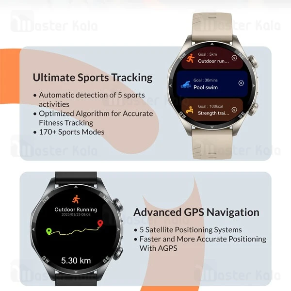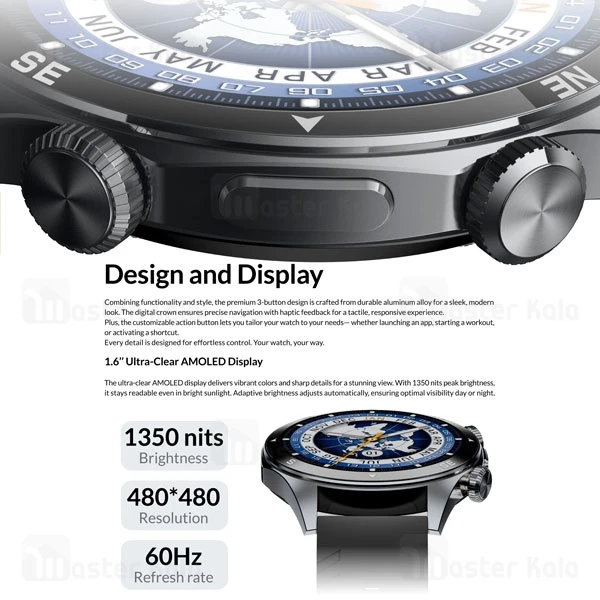 صفحه نمایش 1.32 اینچ AMOLED پایش ضربان قلب، SpO₂، استرس و خواب پشتیبانی از بیش از 100 حالت ورزشی و GPS پنجماهوارهای بلوتوث، تماس مستقیم، موسیقی و دستیار صوتی مقاومت در برابر آب 5ATM