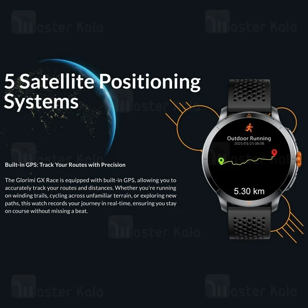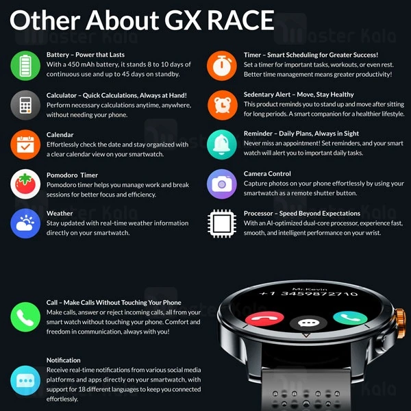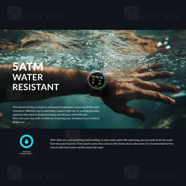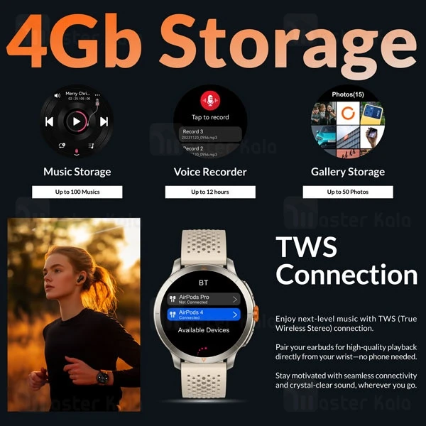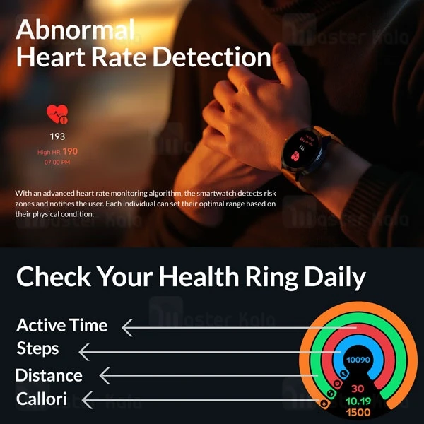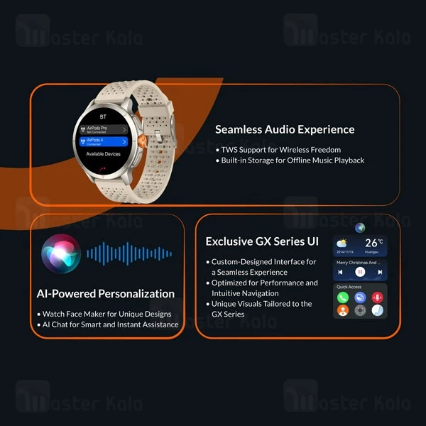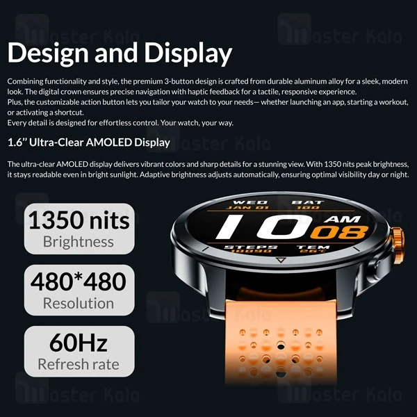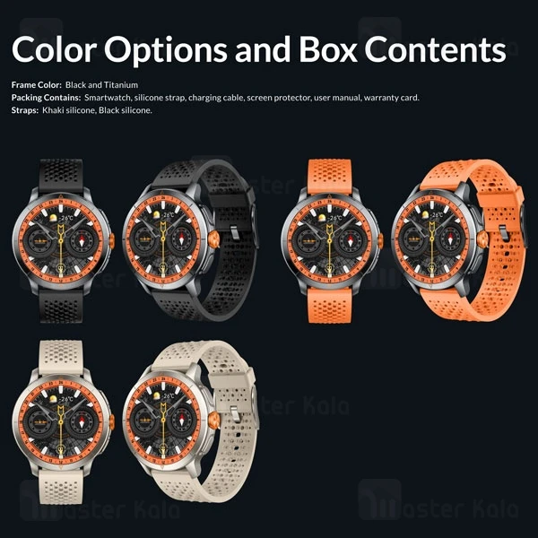 قابلیت مکالمه بلوتوثی پشتیبانی از زبان فارسی مقاومت در برابر رطوبت و آب 5ATM سنجش و پایش بیش از 170حالت ورزشی اندازه گیری سطح اکسیژن خون، ضربان قلب و سطح استرس انتخاب رنگ موجود فریم مشکی - بند نارنجیفریم تیتانیوم - بند خاکی