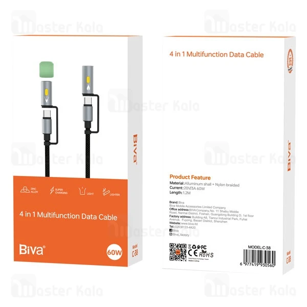 کابل Type-C به Type-C چندکاره بیوا Biva C-38 4 in 1 Multifunction Data Cable طول 1.2 متر توان 60 وات