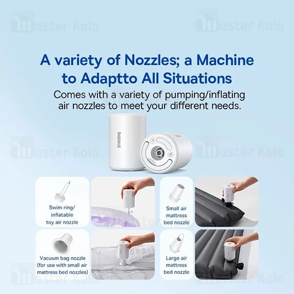 نازلهای تعویضی همراه این پمپ با انواع نازلها عرضه میشود، از جمله نازل مخصوص وسایل شنا، نازل تخلیه هوا، و نازلهای کوچک و بزرگ برای تشکها. به همین دلیل، این دستگاه برای طیف وسیعی از وسایل مناسب است و در کاربردهای مختلف قابل استفاده خواهد بود.